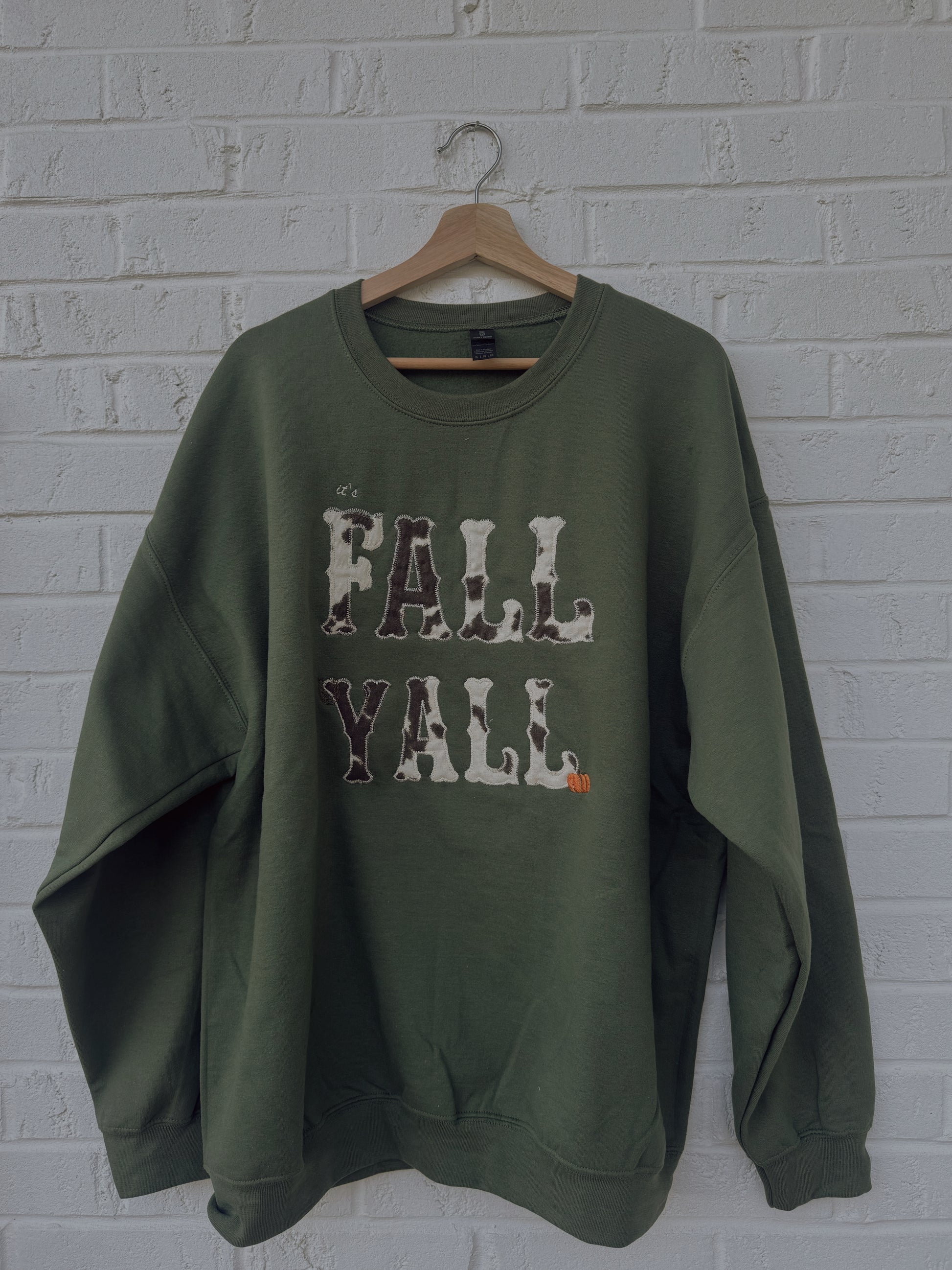 The coziest way to say howdy to sweater weather. This Gildan Heavy Blend crewneck in deep olive green features bold cow-print appliqué letters that spell out “It’s Fall Y’all” — finished with a tiny stitched pumpkin detail for that perfect seasonal touch.